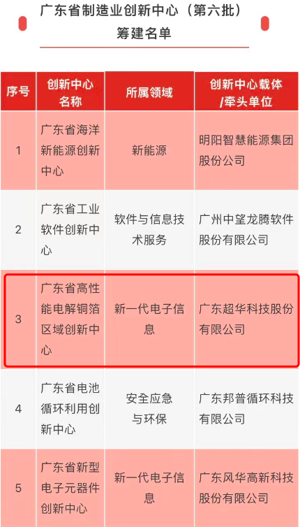 近日,廣東省工業(yè)和信息化廳公布了第六批廣東省制造業(yè)創(chuàng)新中心籌建名單,由廣東超華科技股份有限公司牽頭申報(bào)的廣東省高性能電解銅箔區(qū)域創(chuàng)新中心獲批建設(shè),為廣東制造業(yè)發(fā)展提供創(chuàng)新示范點(diǎn)。據(jù)了解,廣東省制造業(yè)創(chuàng)新中心是面向全省制造業(yè)創(chuàng)新發(fā)展需求,以重點(diǎn)領(lǐng)域前沿技術(shù)和共性關(guān)鍵技術(shù)的研發(fā)供給、轉(zhuǎn)移擴(kuò)散和首次商業(yè)化為重點(diǎn),由企業(yè)、科研院所、高校等各類創(chuàng)新主體自愿組合、自主結(jié)合,以企業(yè)為主體,以獨(dú)立法人形式創(chuàng)建的省級創(chuàng)新平臺,解決關(guān)鍵核心技術(shù)受制于人、產(chǎn)業(yè)共性技術(shù)供給不足、創(chuàng)新成果產(chǎn)業(yè)化不暢的問題,滿足廣東省新一代電子信息、新材料、智能制造、高端裝備制造、新能源汽車、生物醫(yī)藥等戰(zhàn)略性新興產(chǎn)業(yè)發(fā)展需求,助力制造業(yè)轉(zhuǎn)型升級,提高國家制造業(yè)創(chuàng)新能力。此次超華科技牽頭申報(bào)的廣東省高性能電解銅箔區(qū)域創(chuàng)新中心獲批建設(shè),也體現(xiàn)了超華科技深厚的技術(shù)底蘊(yùn)和實(shí)力。